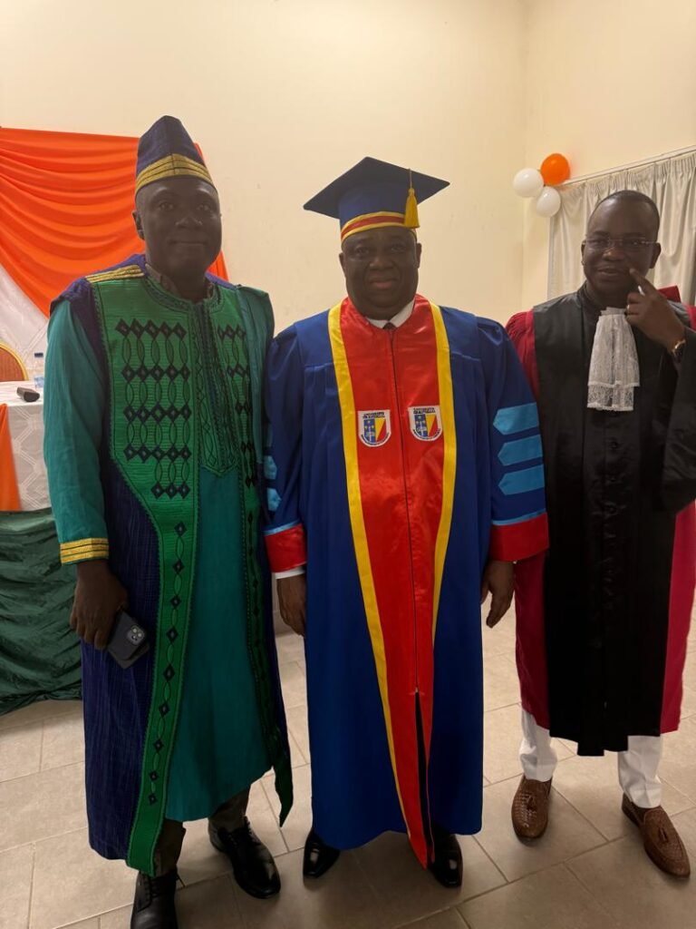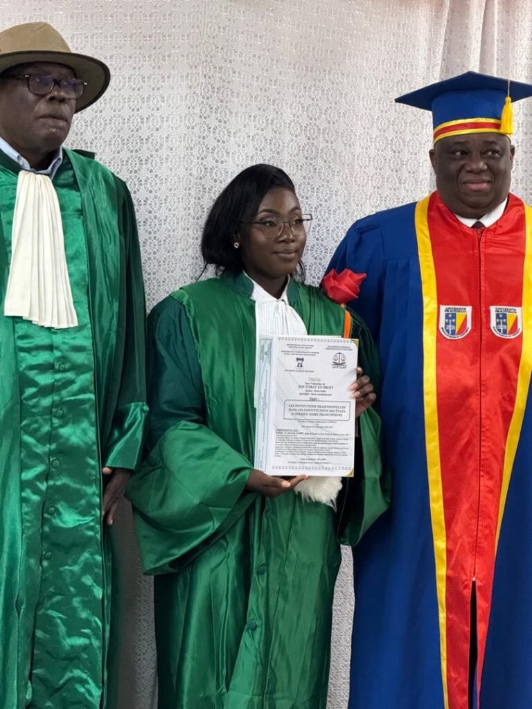 La nouvelle docteure en droit public de l’Université Alassane Ouattara de Bouake Mademoiselle Adjoua Prisca Roselyne Kouassi entourée du Professeur Ordinaire et Doyen honoraire Jean-Louis Esambo Kangashe (président du Jury) et du Doyen honoraire Djedjro Francisco Meledje ( directeur de thèse)